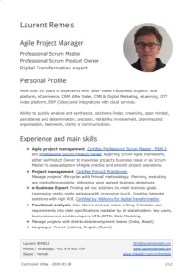 Laurent Remels Agile Project Manager Professional Scrum Master Professional Scrum Product Owner Digital Transformation expert Personal Profile More than 20 years of experience with tailor-made e-Business projects: B2B platform, eCommerce, CRM, After Sales, CMS & Digital Marketing, eLearning, OTT video platform, ERP (Odoo) and integrations with cloud services. Ability to quickly analyze and synthesize, solutions-finder, creativity, open minded, persistence and determination, precision, reliability, involvement, planning and organisation, teamwork, clarity of communication. Experience and main skills ➔ Agile project management . Certified Professional Scrum Master - PSM II and Professional Scrum Product Owner . Applying Scrum Agile Framework, either as Product Owner to maximise project’s business value or as Scrum Master to ease adoption of Agile practice and smooth project operations. ➔ Project management . Certified Prince2 Practitioner . Manage projects’ life cycles with Prince2 methodology. Planning, executing and controlling projects; delivering upon agreed business objectives. ➔ e-Business Expert . Finding ad-hoc solutions to meet business goals. Leveraging ready-made package with innovative touch. Creating bespoke solutions with high ROI. Certified by Wallonia for digital transformation . ➔ Functional analysis . User stories and use cases writing. Translate user requirements into clear specifications readable by all stakeholders: key users, business owners and developers. UML, BPML, Data Modeling. ➔ Manage projects with distributed development teams (India, Brasil). ➔ Languages: French (native), English (fluent) Laurent REMELS info@laurentremels.pm Mobile / WhatsApp: +32 476 441 459 www.laurentremels.pm Skype : lremels www.linkedin.com/in/lremels Curriculum Vitae - 2020-01-09 1/12